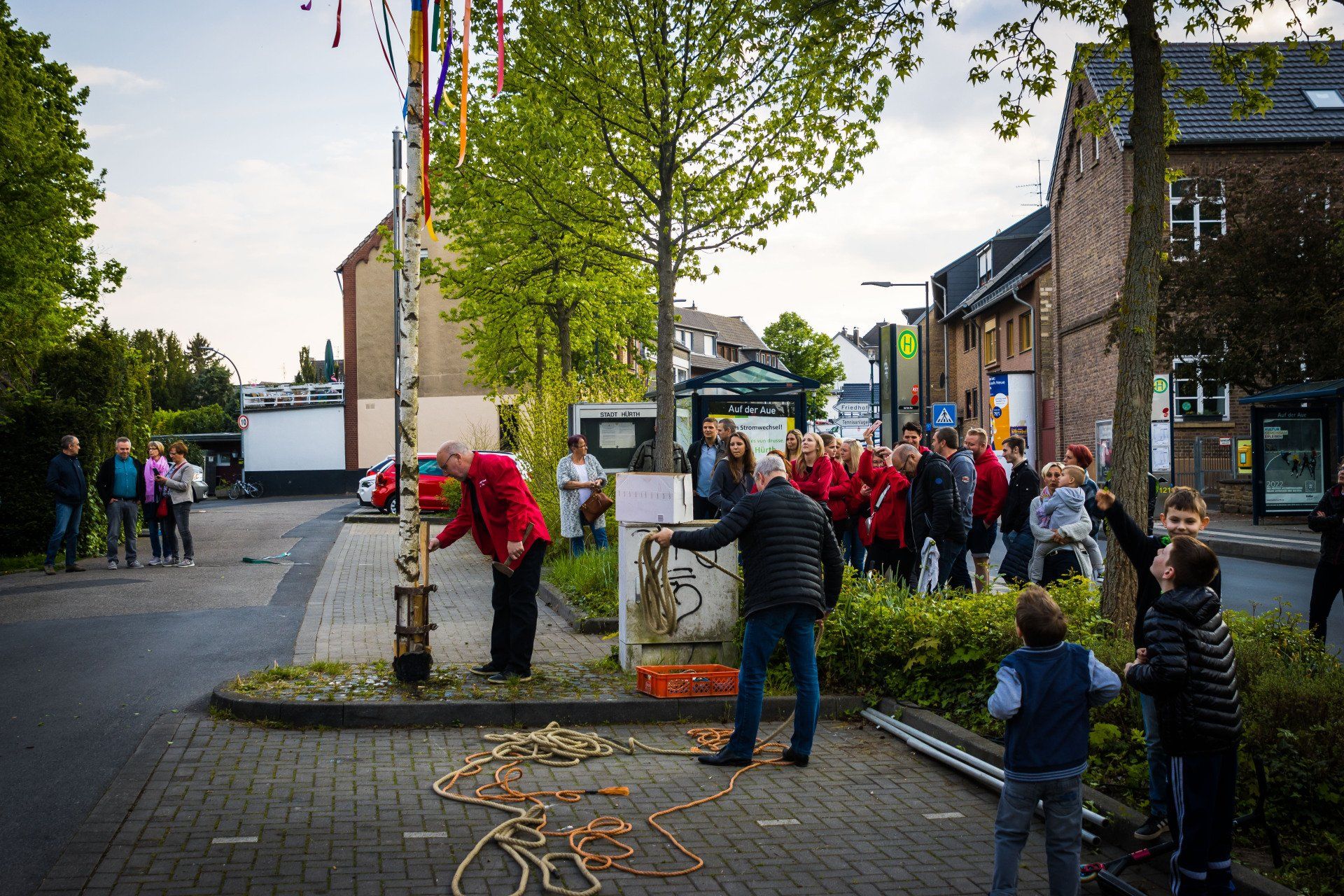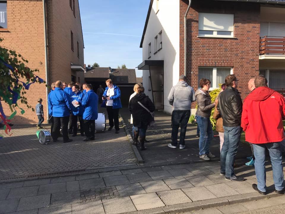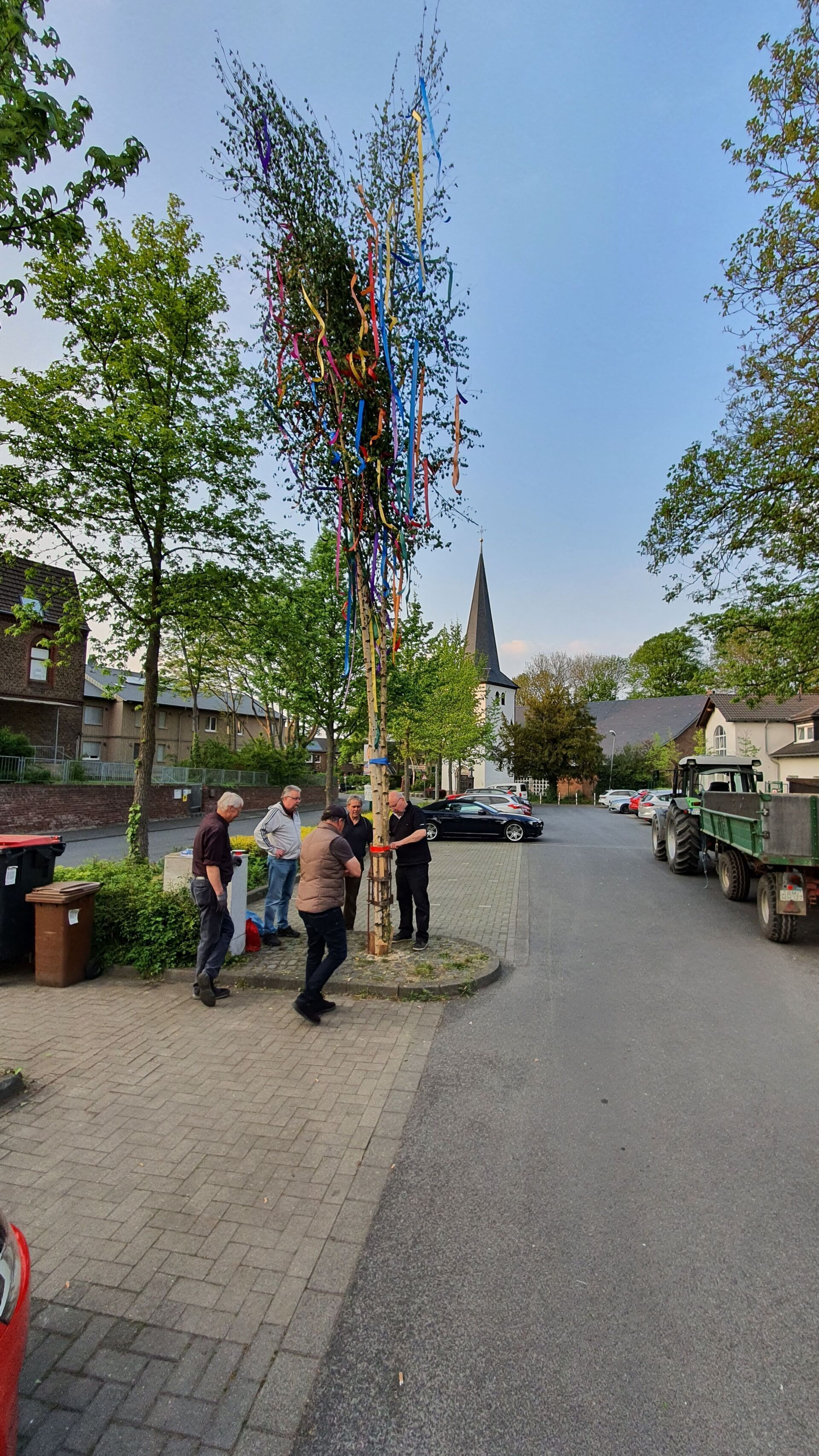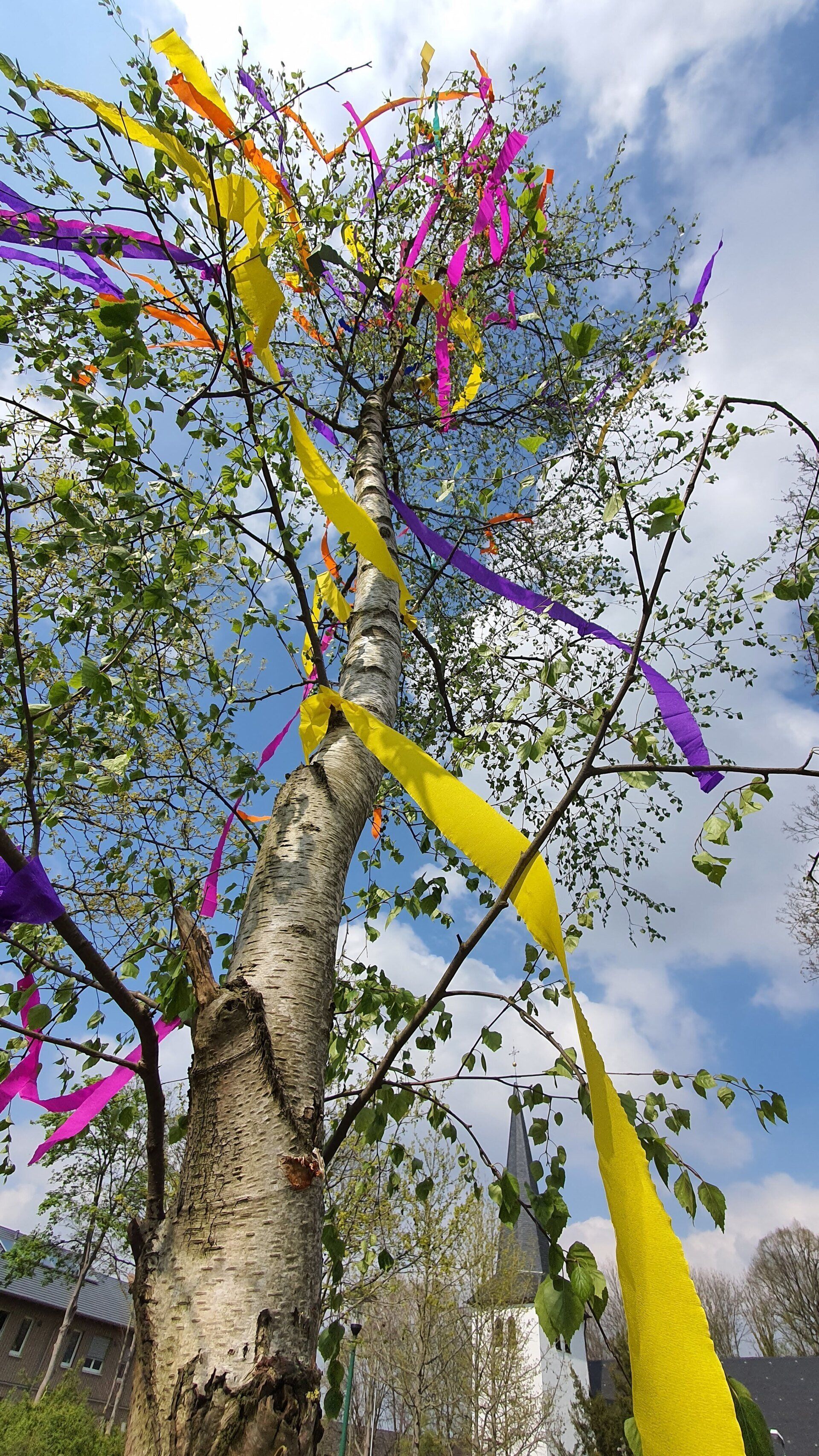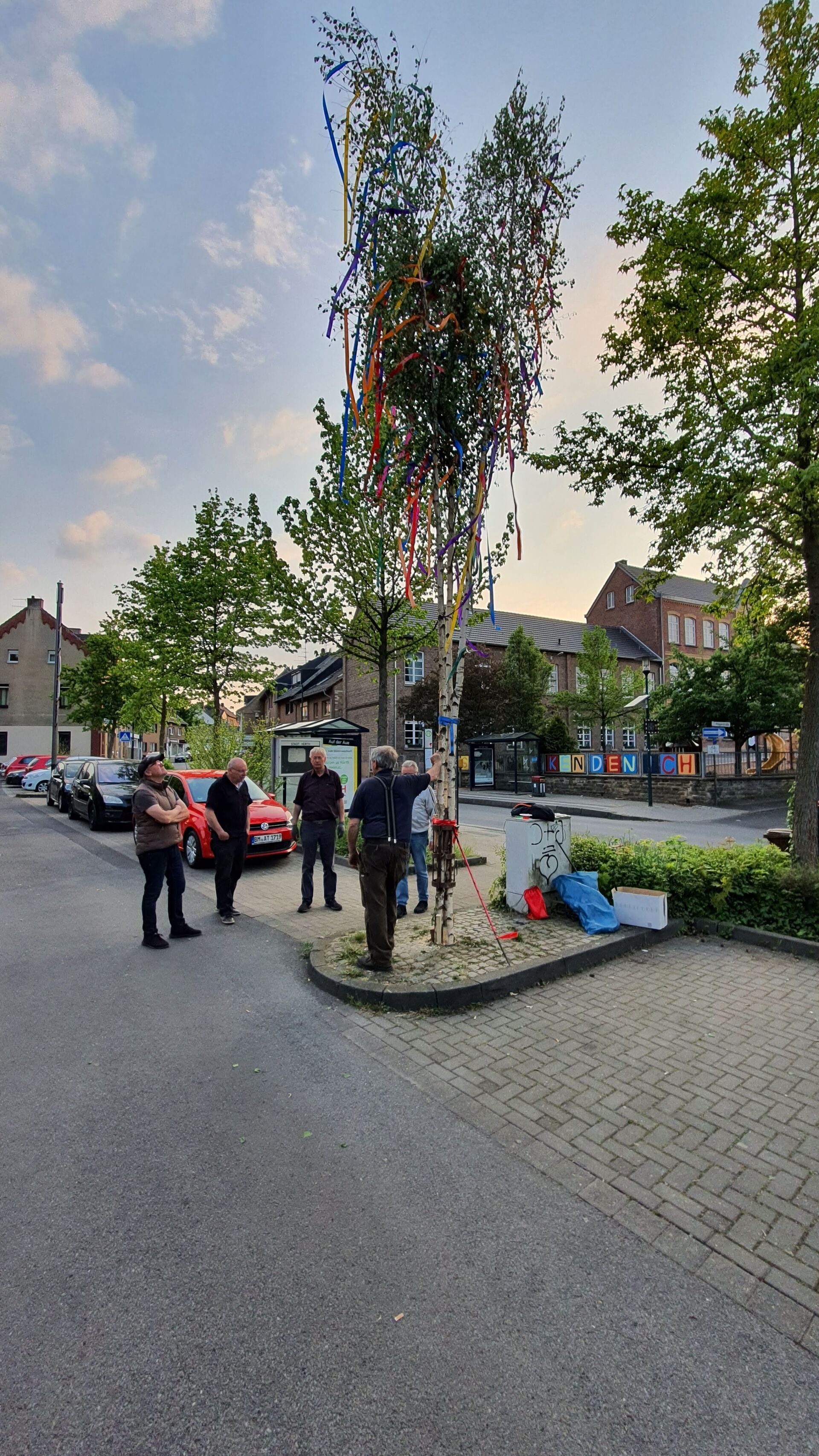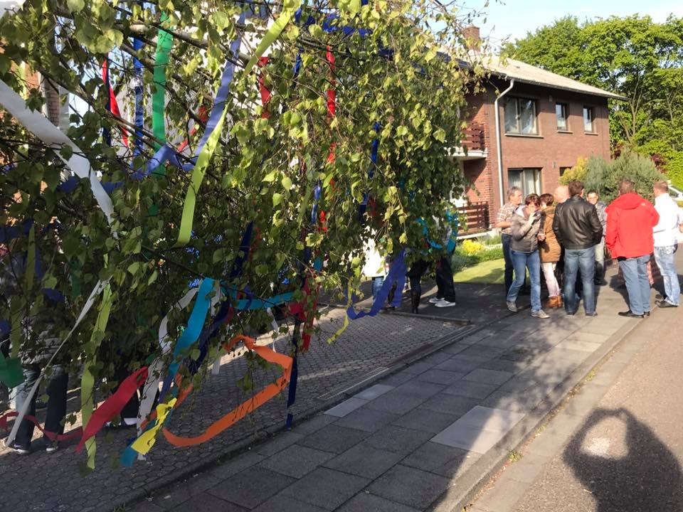 Für diejenigen die den von uns bunt geschmückten Baum noch sehen wollen müssen nur gegenüber in die Plögerstraße gehen etwas hoch und dann links ( Straßenname in der Hütte ) und schon sieht man den schönen Maibaum am Hauseingang am Fallrohr befestigt .