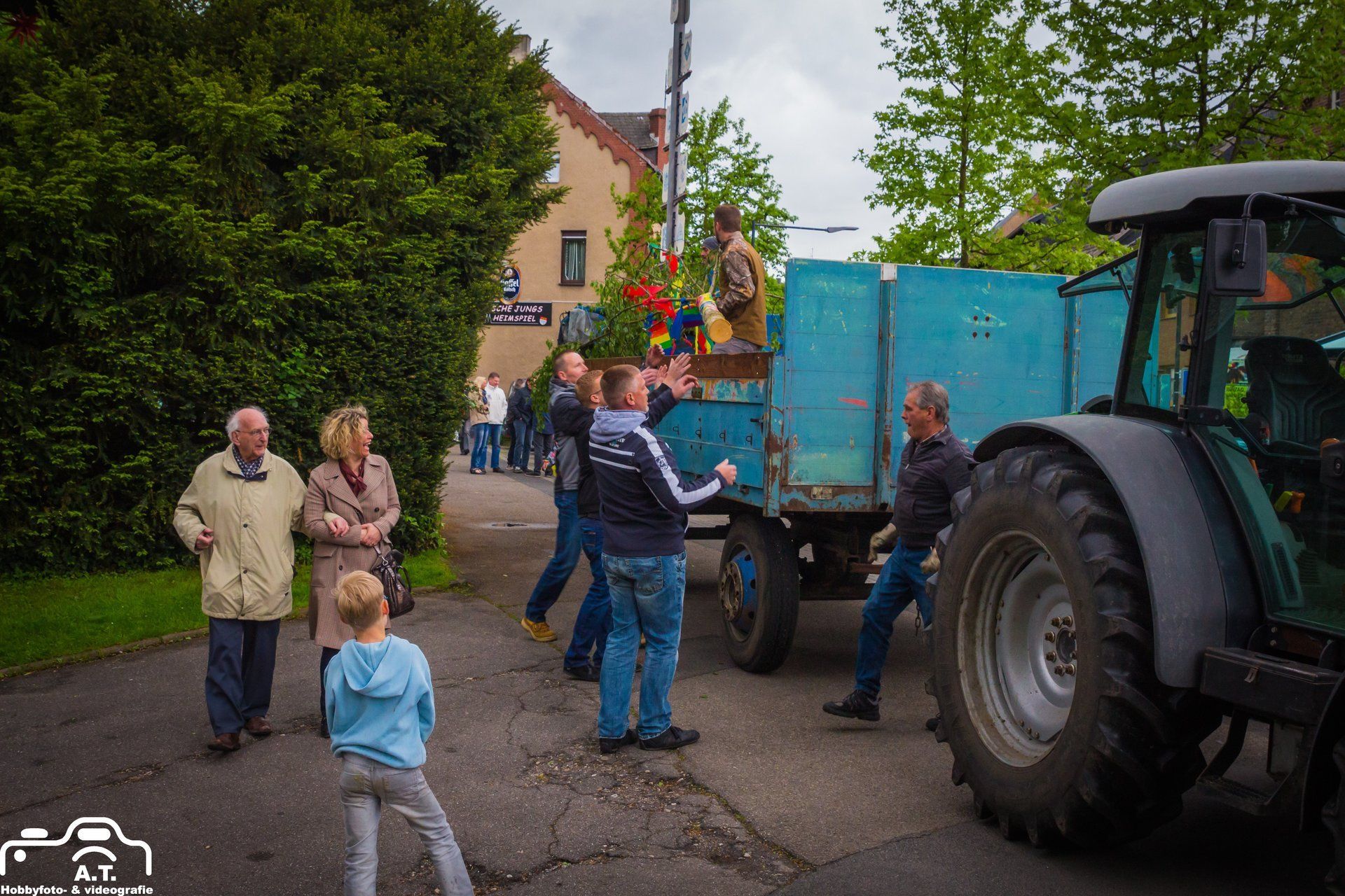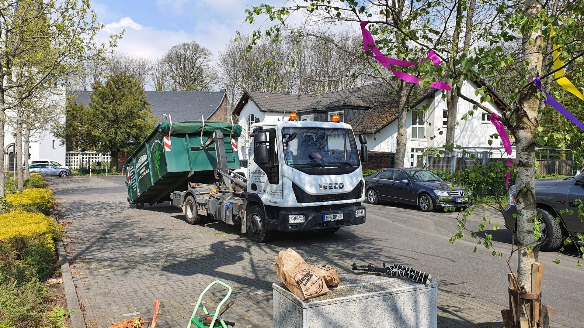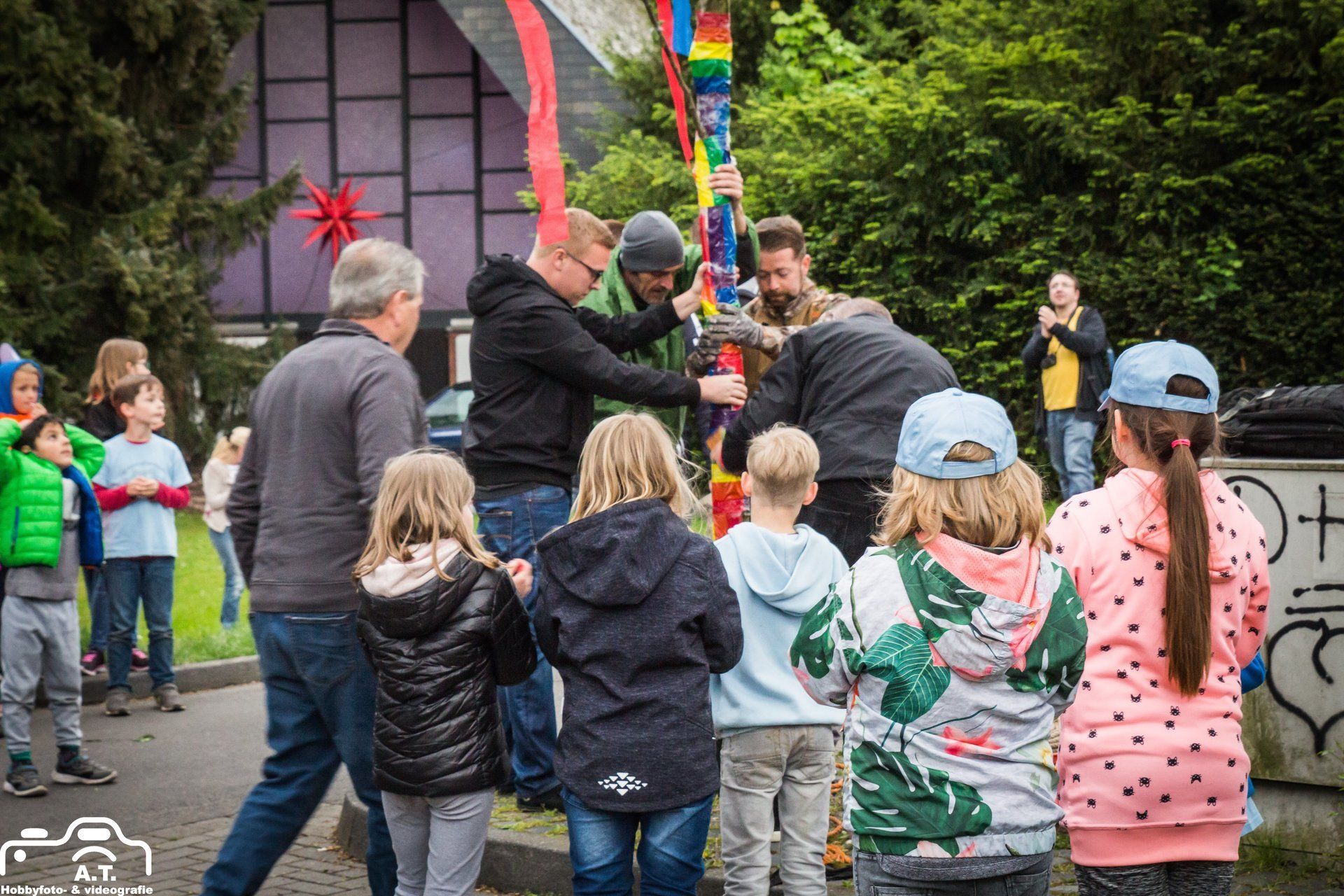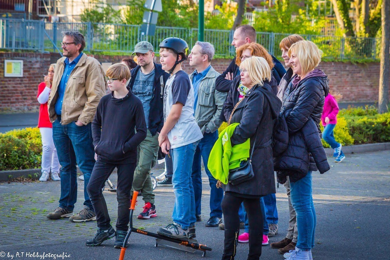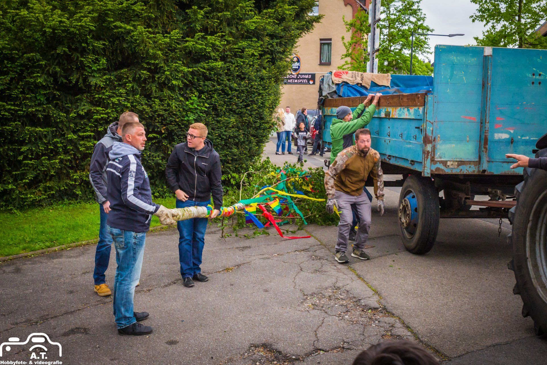 Für diejenigen die den von uns bunt geschmückten Baum noch sehen wollen müssen nur gegenüber in die Plögerstraße gehen etwas hoch und dann links ( Straßenname in der Hütte ) und schon sieht man den schönen Maibaum am Hauseingang am Fallrohr befestigt .