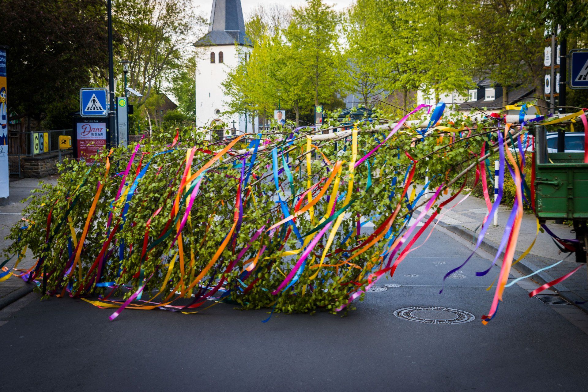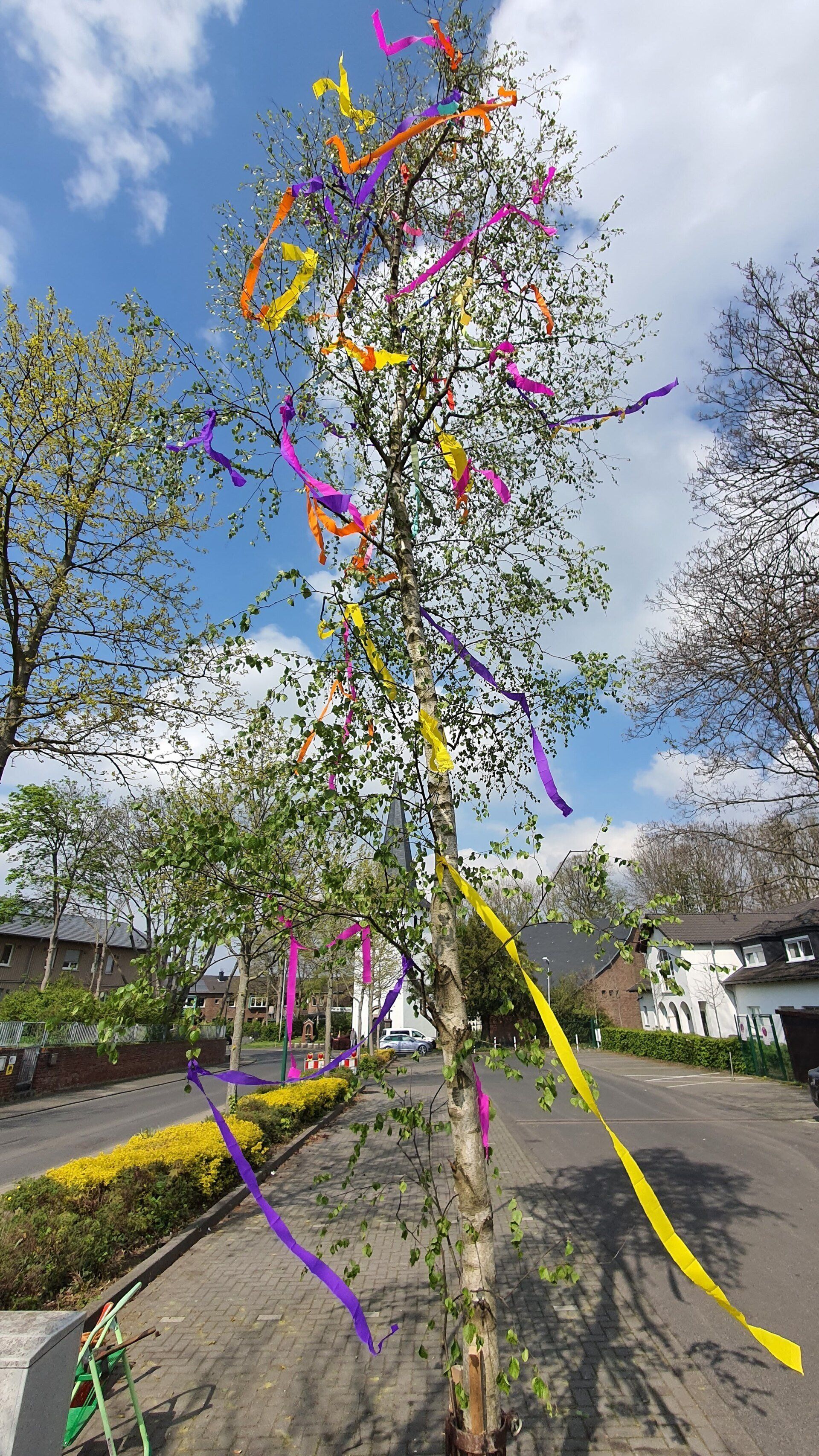 Ein Befragung im im Umfeld der Straße ergab das Unbekannte den Baum dort aufgestellt haben sollen. Der oder die Personen haben sich die Arbeit gemacht und den Baum entsprechend gekürzt bis die von uns in Farbe angebrachte ukrainischer Flagge nicht mehr zu sehen ist. Vermutlich wollte man einen schön Baum haben ohne das Symbol der Flagge und ohne selbst einen Baum aufzustellen.